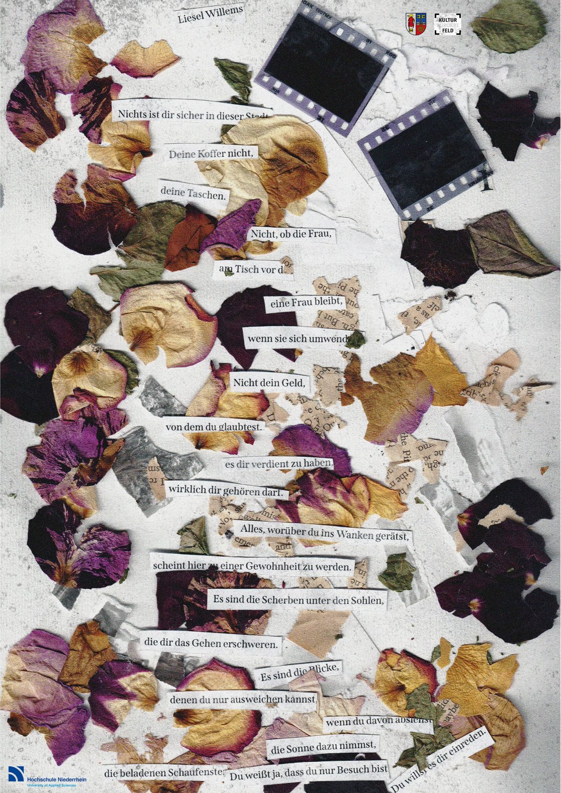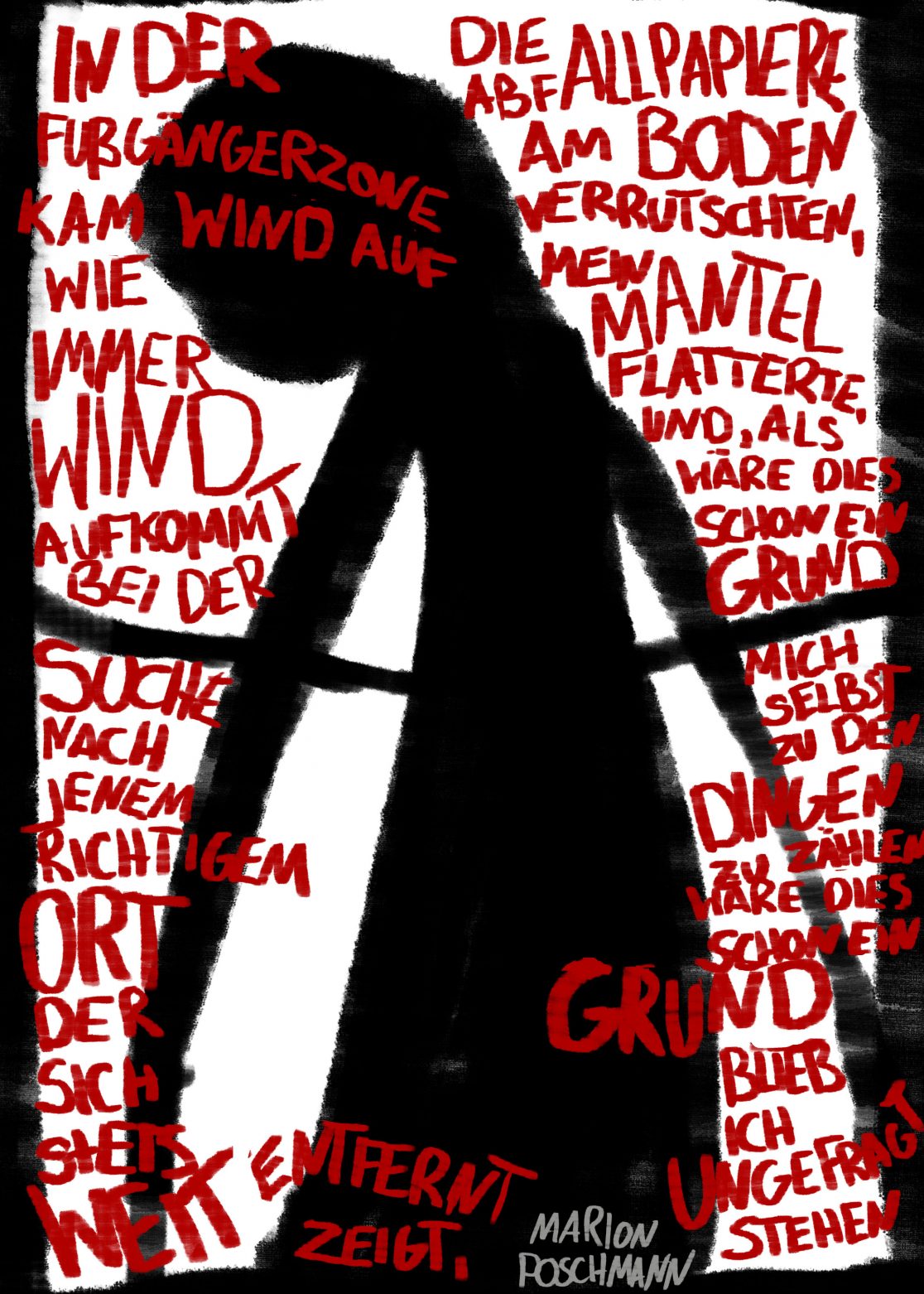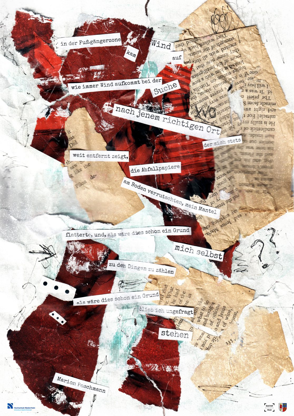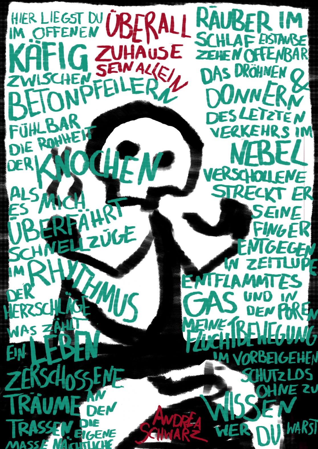 Nach vielen gescheiterten Versuchen habe ich mich letztendlich dazu entschlossen, das Gedicht in meiner Handschrift auf das Plakat zu schreiben. So konnte ich dem groben experimentellen Stil treu bleiben, und gleichzeitig den Text zusammen mit der Illustration übermitteln!