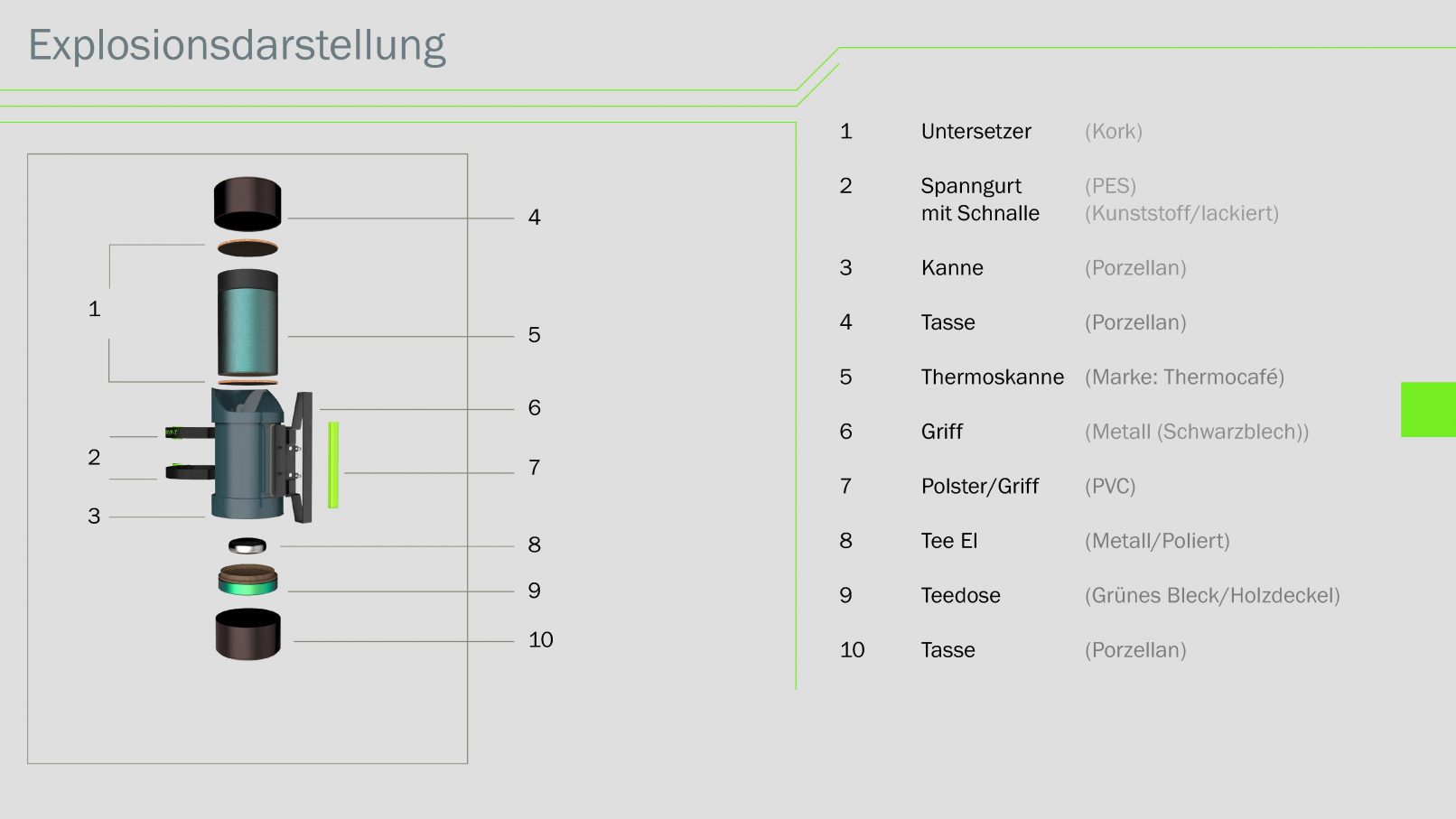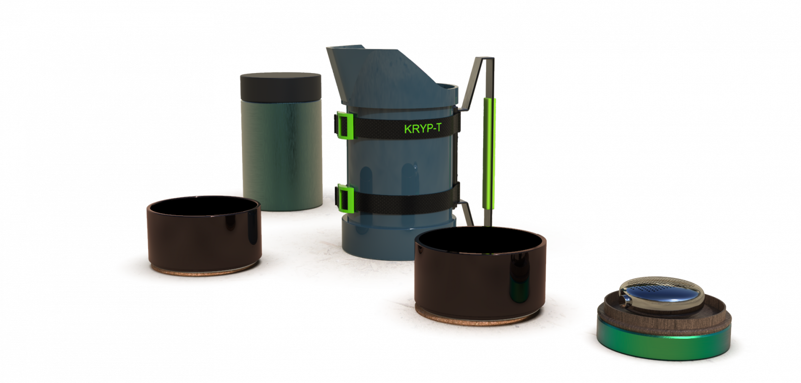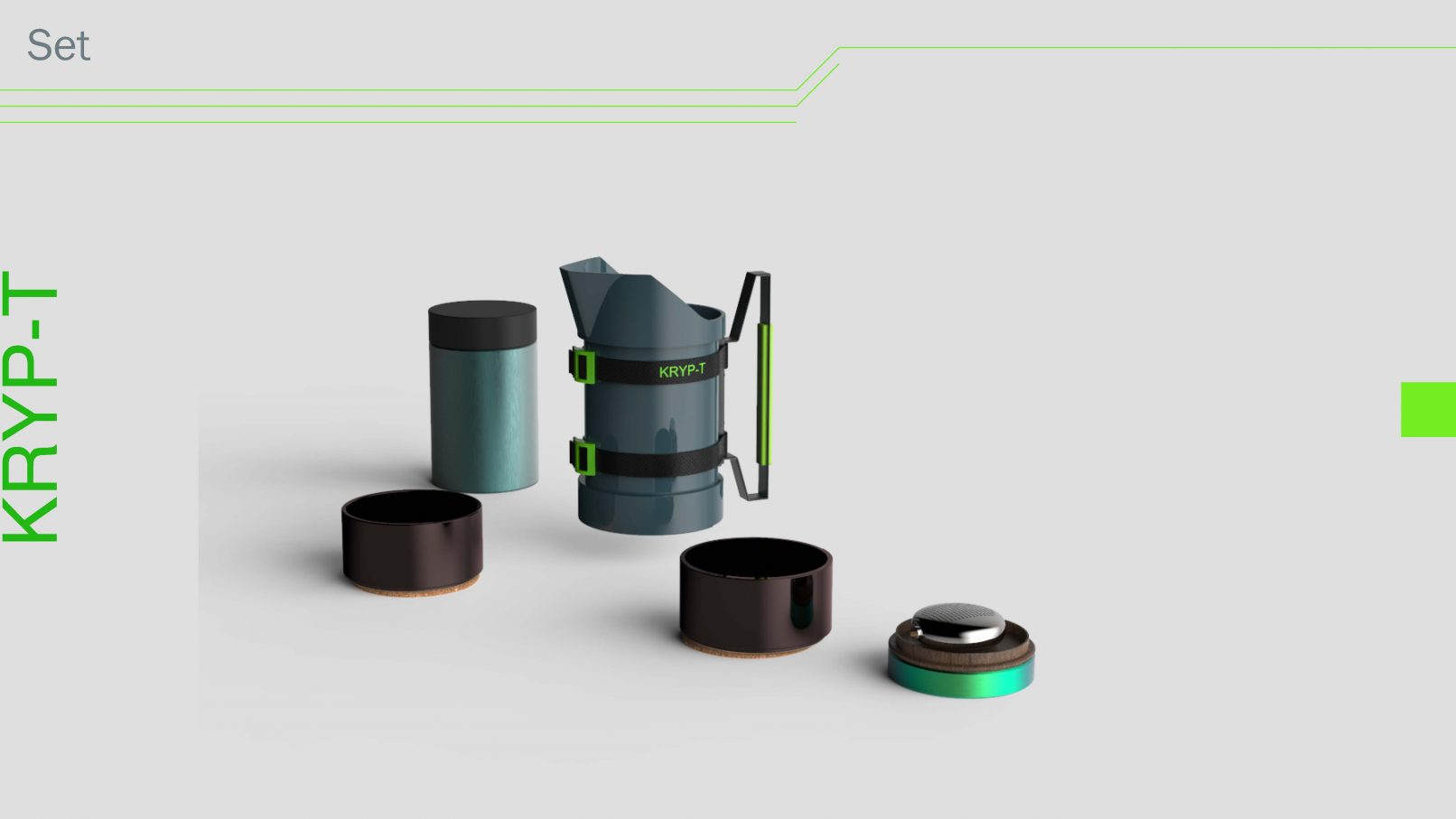 „Kryp-T“ ist ein Outdoor Tee-Set inspiriert von der Urbanen Welt, die uns in der Großstadt tagtäglich beeinflusst und formt. Tee hilft den Menschen sich zu entspannen und verleiht ihm Ruhe. Das Tee-Set besteht aus Keramik und ein Metall-Henkel wird durch ein Spanngurt an den Kannenkorpus gehalten.