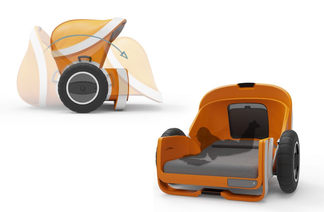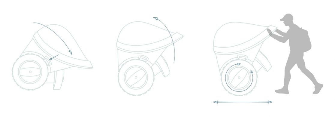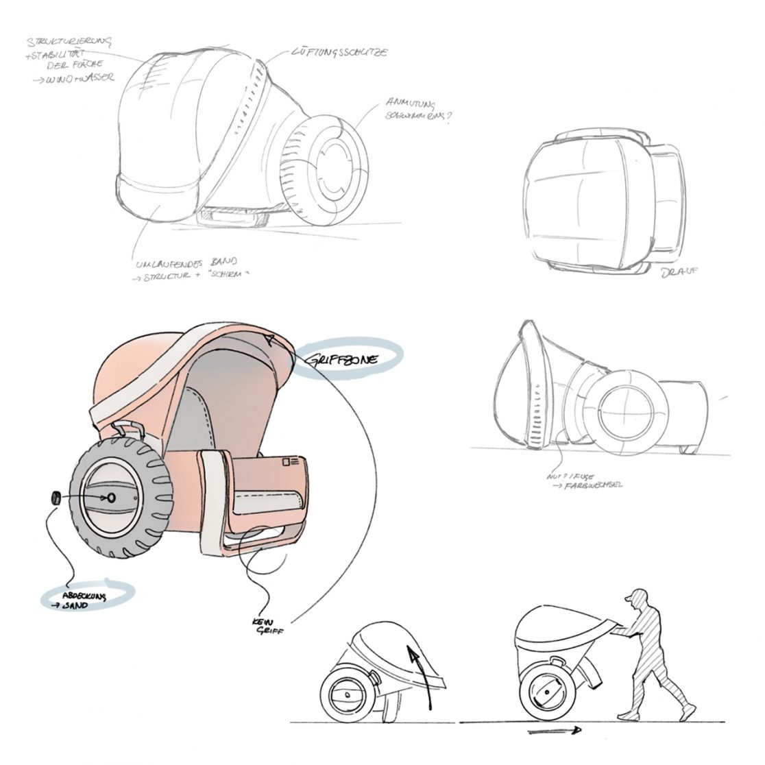 Die Neuentwicklung des Strandkorbes zitiert durch die große Haube und den Unterbau mit den schützenden Seitenwänden die traditionelle Strandkorbform. Der größte Unterschied zu herkömmlichen Strandkörben liegt in der Portabilität. Die großen, seitlichen Räder vereinfachen den Transport erheblich. Eine weitere Besonderheit dieses Strandkorbes ist seine Haube, welche sich vollständig öffnen, sowie nach vorne schließen lässt. Die dynamische Linienführung des Kunststoffgehäuses wirkt zugleich sportlich und modern als auch sinnlich und weich. Das gesamte Erscheinungsbild verkörpert Spaß und Leichtigkeit und lädt jeden zum Verweilen ein.
