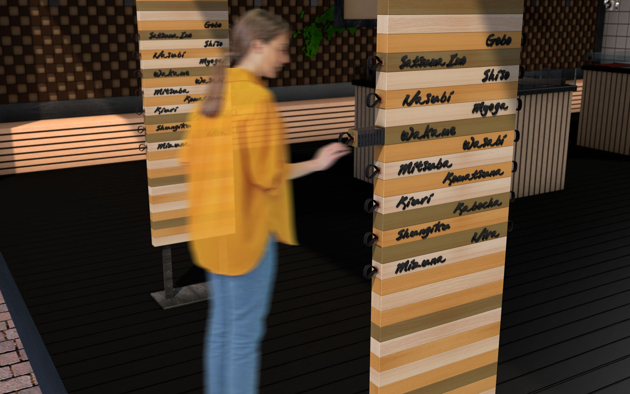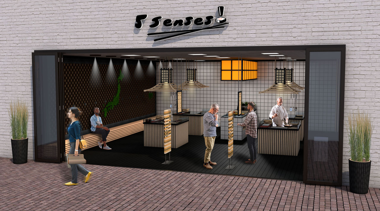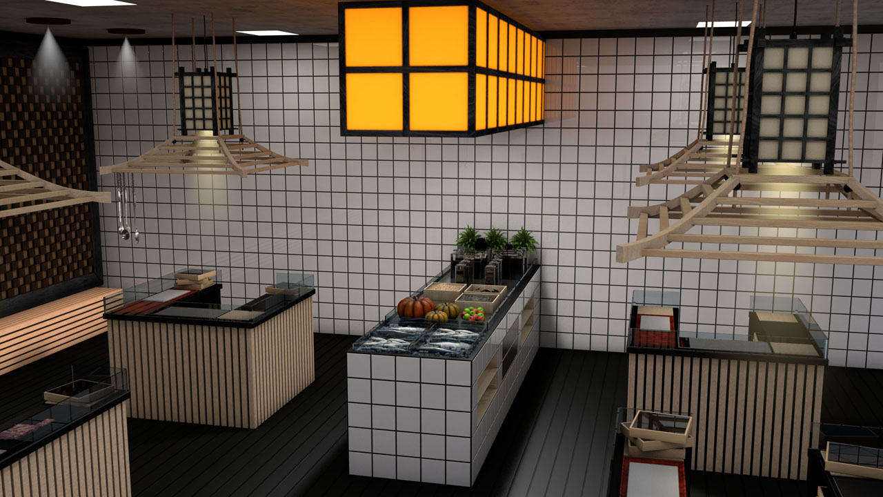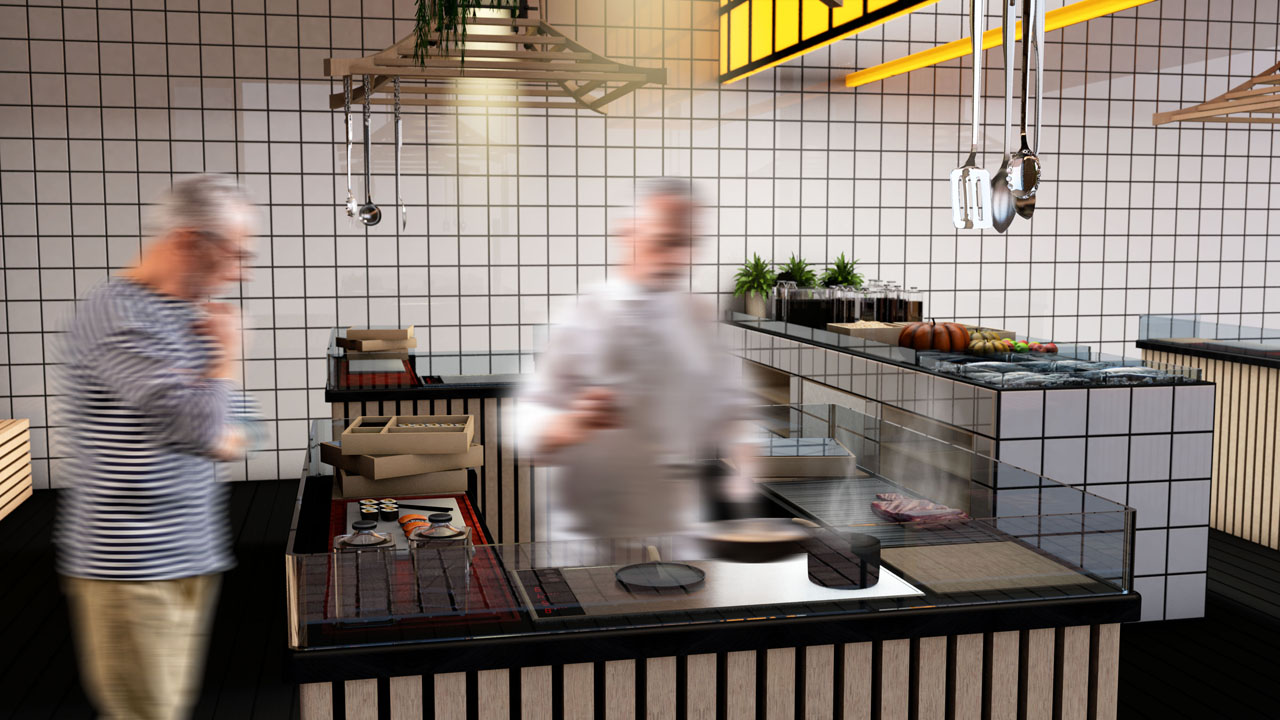 Hierzu dient ein kulinarischer Showroom, der in meinem Beispiel gestalterisch an einem japanischen Restaurant ausgerichtet ist. Kund/innen haben zunächst die Möglichkeit ihre Bestellung abhängig von Aromen der einzelnen Gerichte zu tätigen und anschließend den Köchen/-innen bei der Auswahl der Zutaten, sowie der Zubereitung über die Schulter zu schauen.